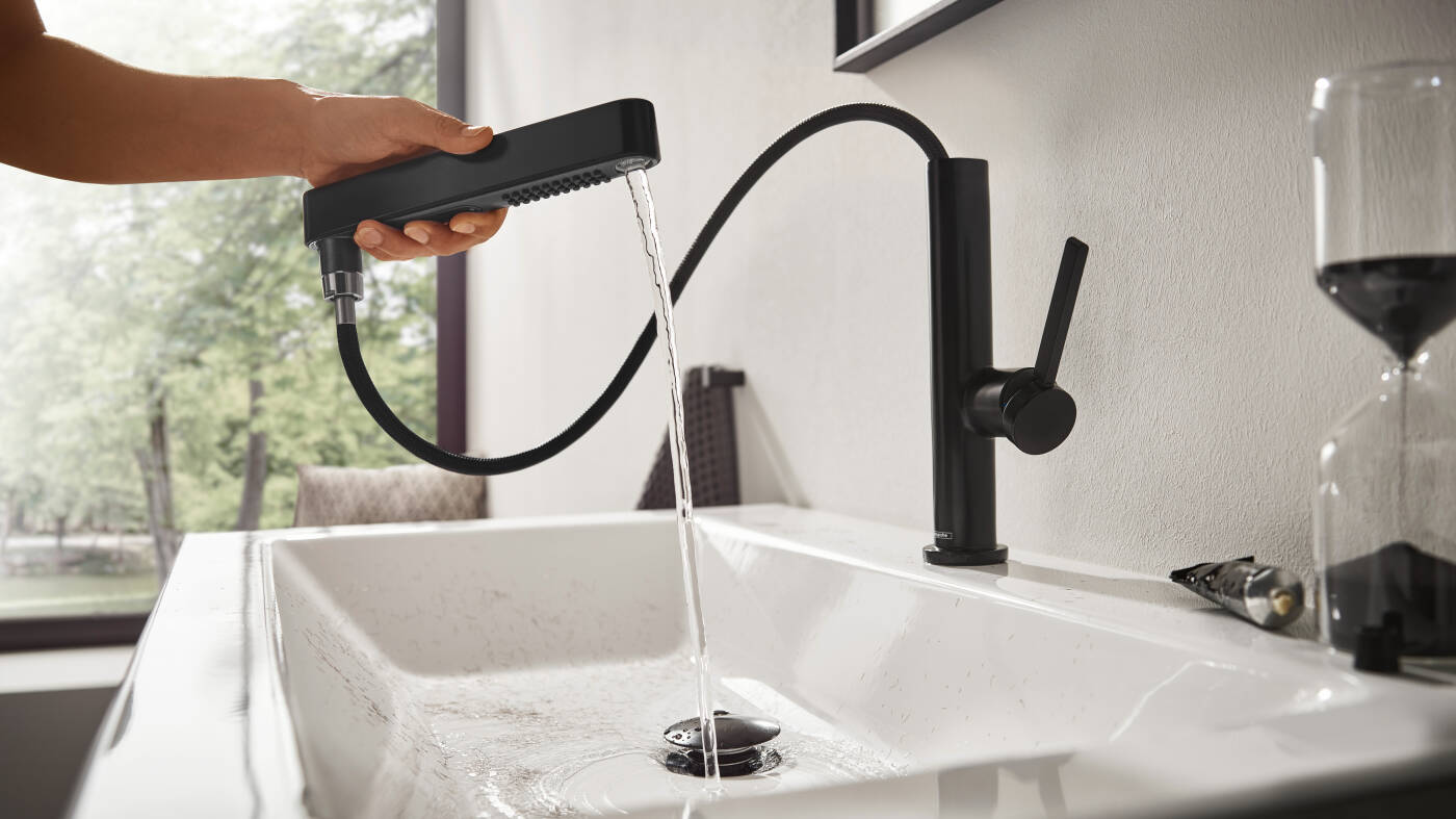 - Schlank designte Armaturen, die sämtliche Routinetätigkeiten im Bad zum Vergnügen machen. Der Waschtischmischer ist das Herzstück der Serie. Er begeistert dank alltagsfreundlicher Ausziehbrause mit zwei Strahlarten.